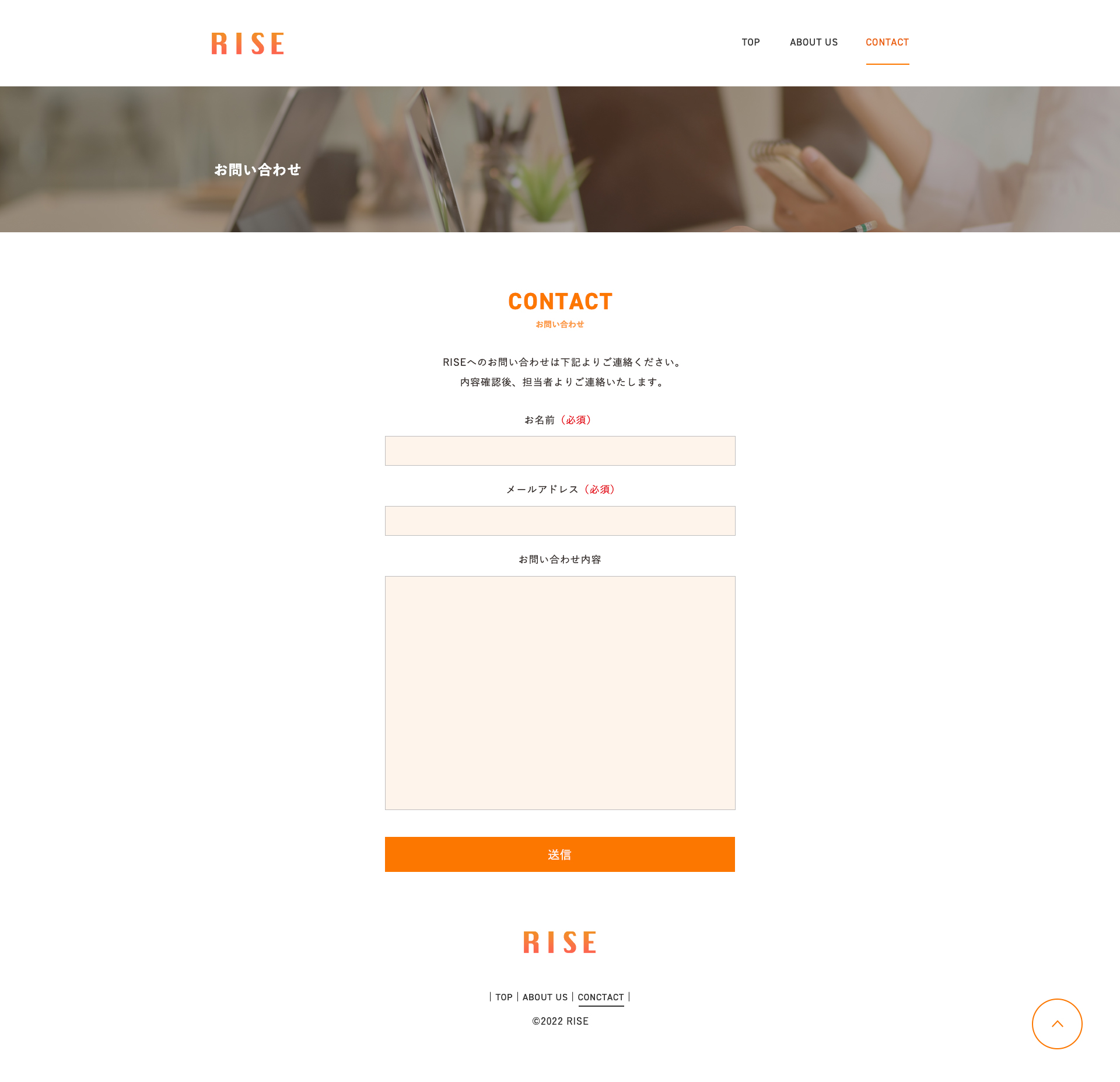 • 「RISE」という名前の会社に設定しましたので、太陽をイメージするオレンジをコーポレートカラーとし、ページ全体を温かみのあるオレンジベースのデザインにしました。